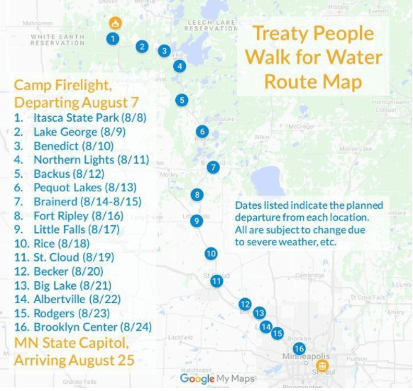 Walkers plan to make the 235 mile journey to the State Capitol by August 25. They are planning acts of civil disobedience in order to demand that those in power honor the treaties and protect the public water from a foreign corporation.