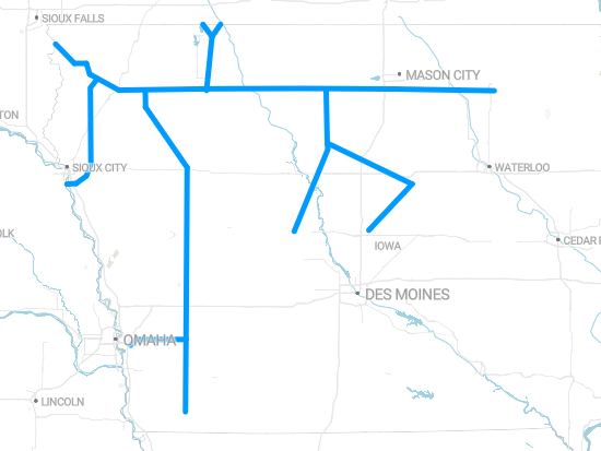 The map below shows the approximate planned route for a proposed carbon capture pipeline in Iowa. The pipeline would enter Iowa in the west from Lyon and Woodbury counties and extend east to Chickasaw County. It would have extensions north through Dickinson County, and south to Fremont, Greene and Story counties.