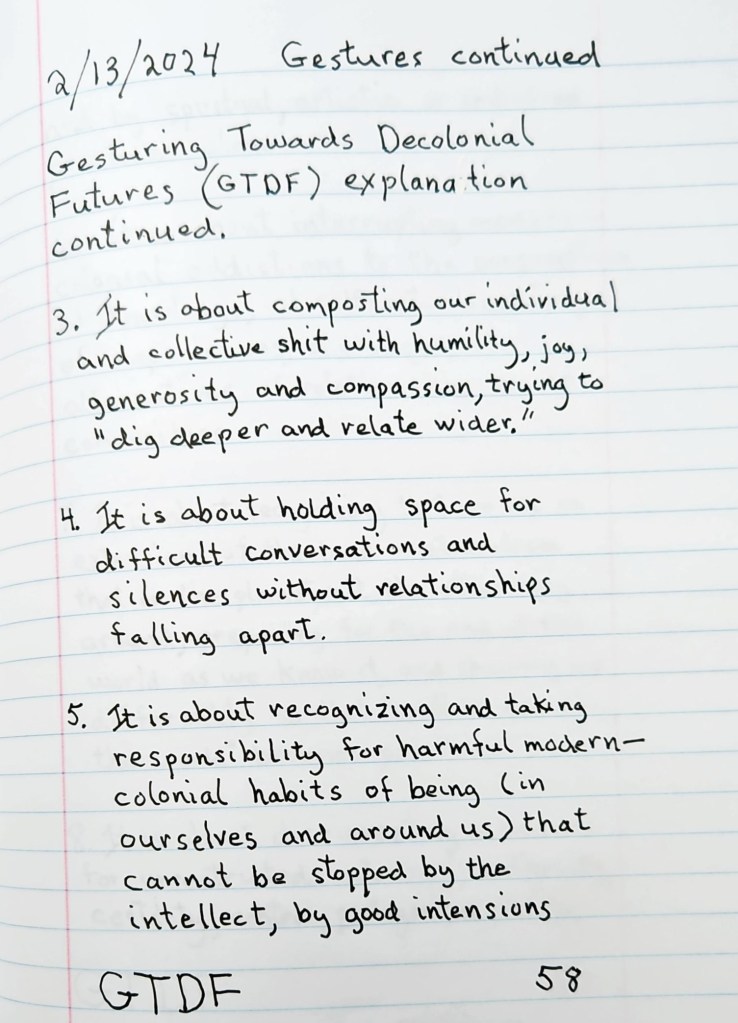 Gesturing Towards Decolonial Futures (GTDF) is an arts/research collective that uses this website as a workplace for collaborations around different kinds of artistic, pedagogical, cartographic, and relational experiments that aim to identify and de-activate colonial habits of being, and to gesture towards the possibility of decolonial futures.